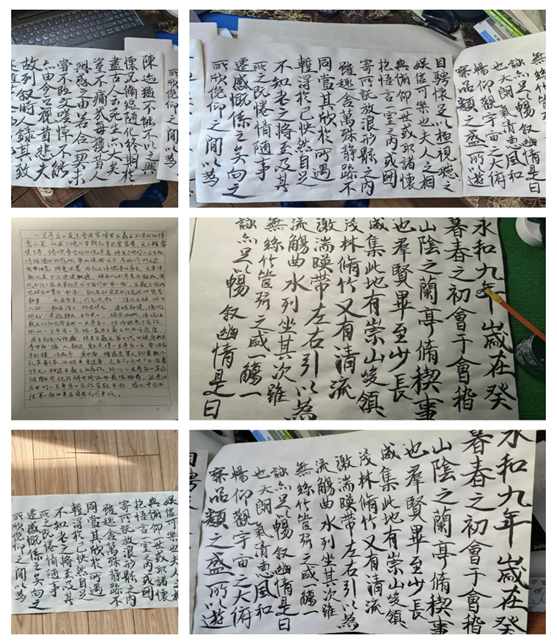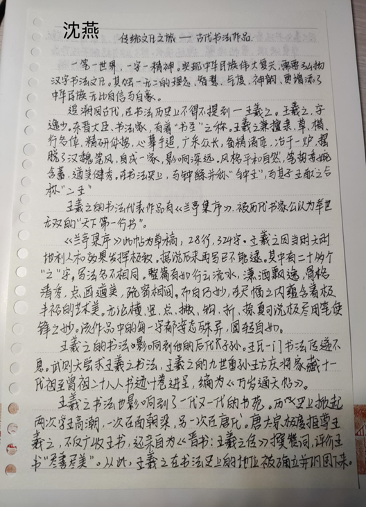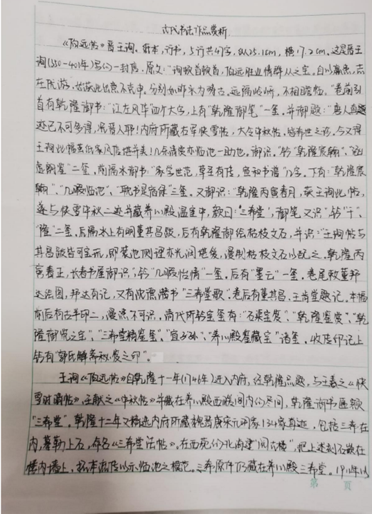 历史长河大浪淘沙,为我们沉淀了灿若星辰的书法作品,此次赏析,同学们围绕王羲之的《兰亭集序》,王洵的《伯远帖》,颜真卿的《祭侄文稿》《裴将军诗帖》《多宝塔碑》,欧阳询的《张翰思鲈帖》《九成宫醴泉铭》,苏轼的《归去来兮辞》《寒食帖》,赵孟頫《洛神赋》《赤壁赋》等作品,从个人情感、书法技艺、表现技巧和历史影响等角度用书写的方式畅谈对书法作品的认识,22级历史B班的杨鸿翼同学还泼墨挥毫临写了《兰亭集序》,展现了同学们良好的赏析能力和书法水平。
