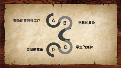 首先,华吉老师讲述了在教师专业方面遇到的四个复杂性问题。第一,繁杂的事务性工作。第二,学科的复杂。第三,学生的复杂性。最后,自我的复杂。