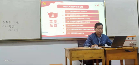 第二阶段,由2021届中国史博士生姚三刚同学以“中国共产党百年辉煌”为题,开展主题党课讲解。本次党课共分为开天辟地,改天换地,翻天覆地,惊天动地四个模块,姚三刚同学通过梳理党的百年奋斗史,分析中国共产党带领中国人民从站起来到富起来,再到强起来的艰辛历程。总结出中国共产党百年历史的宝贵经验就是必须坚持党对一切工作的领导;必须坚持马克思主义的指导地位;必须坚持走中国特色社会主义道路必须坚持以人民为中心;必须坚持把发展作为党执政兴国的第一要务;必须坚持深化改革开放;必须坚持民主集中制;必须坚持科学执政、民主执政、依法执政;必须坚持社会主义意识形态;必须坚持党对人民军队的绝对领导;必须坚持巩固和发展最广泛的爱国统一战线;必须坚持推进人类和平与发展的崇高事业。