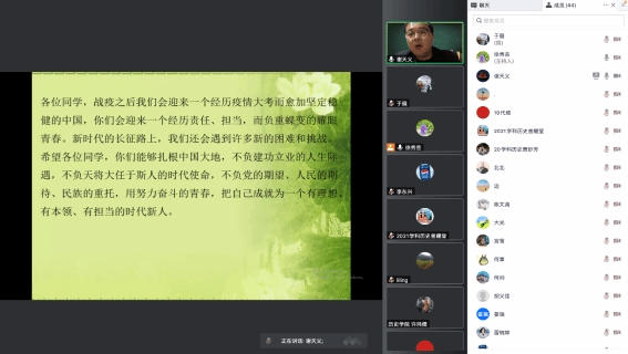 随后,伟德2021届中国史博士生谢天义同学以《破茧化蝶,淬炼成钢——谈中国青年的责任与担当》为题开展主题党课讲解。主题党课紧紧围绕“青春蝶变”、“责任担当”、“爱国大义”、“心怀天下”四个主题展开论述,将战“疫”中的感人故事呈现在我们面前,提出年轻人要知国爱国、求真至善,鼓励青年人扎根中国大地,谱写心怀天下、肩担大任、行有大德的大写青春。