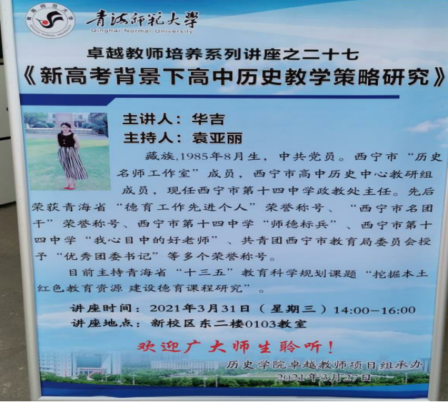 为了进一步拓展师范生的视野、开阔思维,提升师范生高中历史教学备课及教学设计能力,根据学校教务处青师教字[2021]16号文件《关于开展2021年上半年卓越师范生教育见习和实践性导师讲座活动的通知》精神,2021年3月31日下午两点,伟德betvlctor1946源于英国卓越分项目组开展了“历史专业卓越教师培养系列”之第二十七场讲座,特邀请西宁市第十四中学政教处主任华吉老师为历史专业师范生做了题为:“新高考背景下高中历史教学策略研究”的讲座,本次讲座由伟德betvlctor1946源于英国卓越项目组负责人、硕士生导师袁亚丽教授主持,历史专业在校19级、20级本科生和20级学科教学(历史)硕士研究生共135人参加了此次讲座。