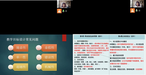 讲课中,边芸老师从什么是教学设计展开讨论,通过指出在历史教学过程中教学目标设计常见问题,分析总结出确定教学目标的依据:一、课程标准确定的课程目标。二、对学科知识的分析。三、对学生的分析。边芸老师强调,历史教师制定教学目标,需通过具体知识的讲授达成,知识如何教,教知识的哪些方面,需要对知识进行分析,同时还需要考虑后续课程的教学需要,另外还需要掌握学生的心理动态和认知水平。