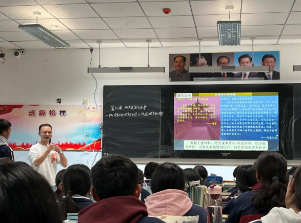 在此次同课异构活动中,2023级专硕实习生郭彦玲以“逃出大英博物馆”视频为导入,提出问题“视频中的这些文物大多是在什么时候流落海外的?”引导学生进入本课的学习,以“战前:中西方的差异、战时:中西方的碰撞、战后:中国人的态度”为线索,通过地图分析、史料分析与名词解释等方式,在小组探究、教师讲授中完成本课的教学任务,落实学科核心素养,最后再以“逃出大英博物馆”视频中的小片段“愿山河无恙”进行主题升华,浸润学生的家国情怀。郭彦玲在课堂中互动性强,注重鼓励与引导学生根据史料回答问题,培养学生的历史思维能力。