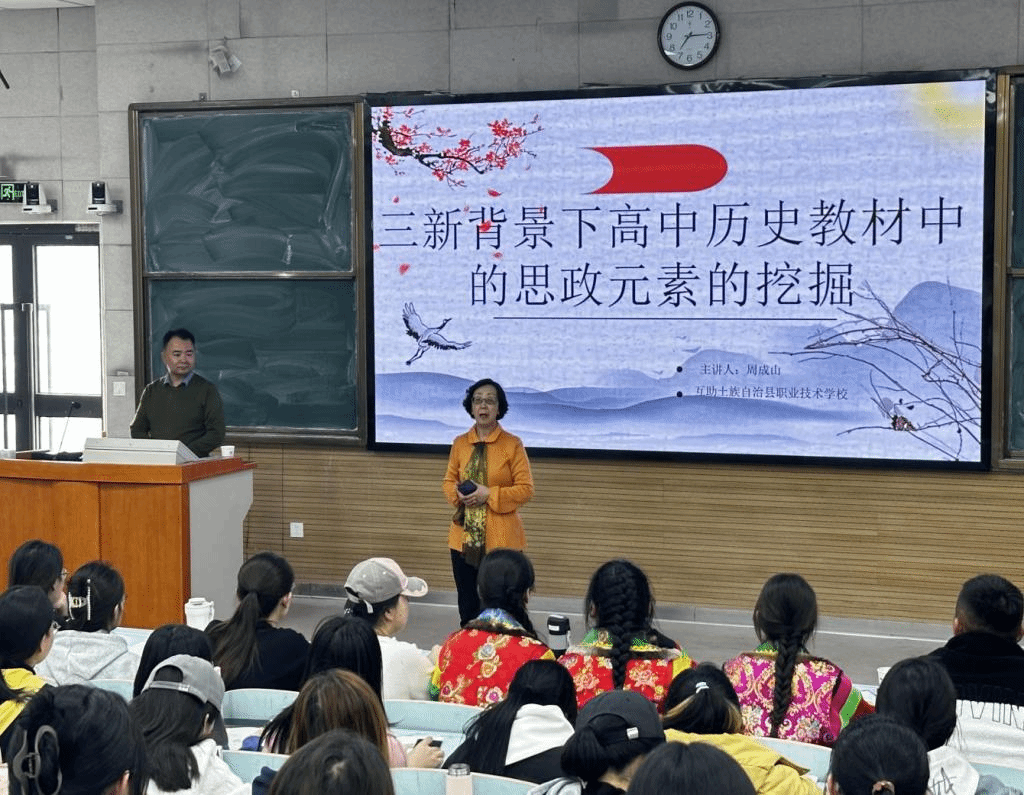 最后,在周老师与互助县职业技术学校的高三学生的配合下,现场学生积极参与互动,在师生互动中加深了对互助县土族民族文化遗产的了解,传播了土族民族优秀传统文化,培养了历史专业学生的民族认同感、自豪感、责任感。