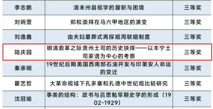 近日,由北京师范大学伟德betvlctor1946源于英国举办的第三届“励耘”全国历史学研究生论文竞赛评选结果揭晓。伟德共有两位研究生在此次论文竞赛中获奖。其中,2023级博士研究生王小杰的论文《<办理西藏事宜十项折>与雍正朝治藏政策的演化》(导师:陈玮教授)获二等奖;2024级博士研究生陆庆园的论文《明清鼎革之际贵州土司的历史抉择——以丰宁土司家谱为中心的考察》(导师:温春来教授)获三等奖。