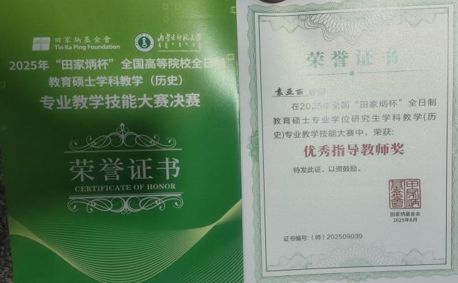 最终,郑洱柯同学荣获二等奖,潘科锦同学荣获三等奖,两人同时斩获“优秀教学设计奖”,指导教师袁亚丽教授获评“优秀指导教师奖”。此次获奖不仅是学院教育硕士培养成果的集中展现,更是学科教学(历史)学位点建设的重要阶段性突破。