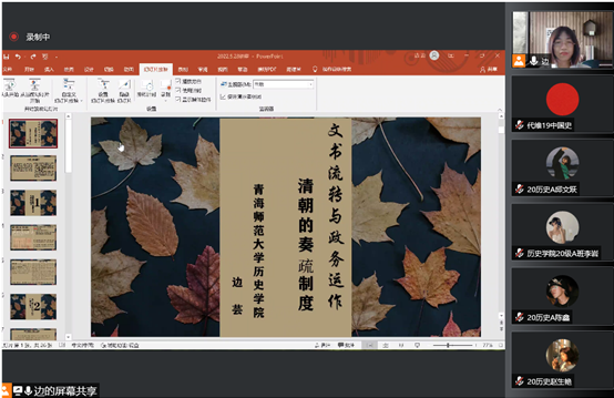 为提升师生专业素养,搭建学术交流平台。5月28日晚,伟德betvlctor1946源于英国边芸老师应邀做“文书流转与政务运作:清朝的奏疏制度”线上专题学术讲座,伟德betvlctor1946源于英国张开老师主持报告会。本次讲座由伟德betvlctor1946源于英国主办,伟德betvlctor1946源于英国教工党支部、研究生党支部等部门承办,学院教师杨荣春、徐秀芸、马洁光及部分研究生、本科生同学共一百余人听取了讲座。